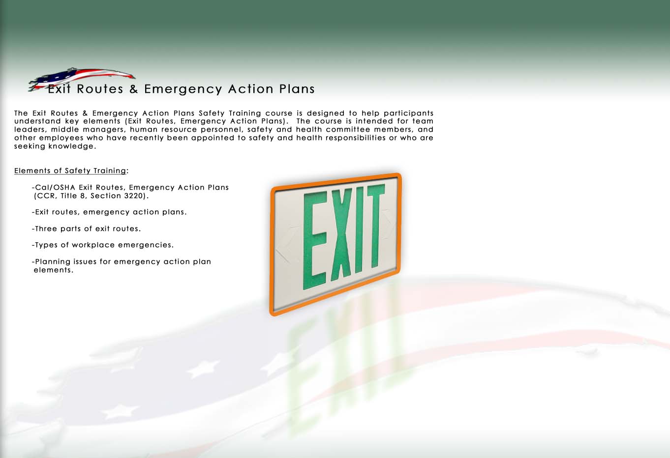 PPE Safety Training Exit Route Safety Training First Aid Safety Training Fall Arrest Safety Training Heat Stress Safety Training Ergonomics Safety Training
